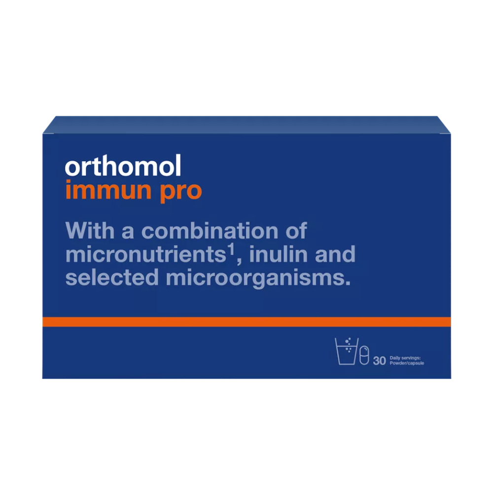 Jaunākā Orthomol Immun Pro formula, kas apvieno klasisko imunitātes paciņu (C vitamīns 950 mg, cinks, selēns, bioflavonoīdi) ar papildu kapsulu, kurā ir 6 miljardi dzīvo pienskābo baktēriju (Bifidobacterium un Lactobacillus celmi) + inulīns kā prebiotika. Tieši tāds divkāršais efekts, kādu iesaka mūsdienu zinātne: 70 % imūno šūnu atrodas zarnās.